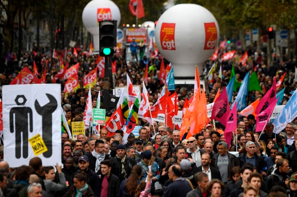 Decenas de miles de personas manifestaron este sábado en París, en medio de una fuerte presencia policial, contra las reformas impulsadas por Emmanuel Macron un año después de su elección presidencial en Francia.