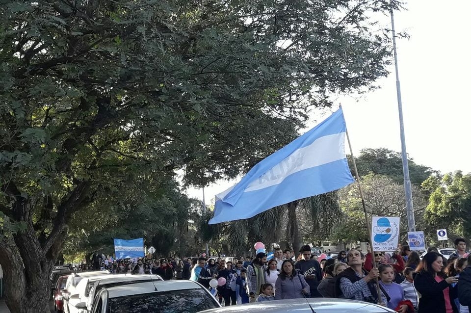 Los manifestantes se mostraron con banderas argentinas y con un pañuelo celeste, nuevo símbolo de quienes se oponen al aborto, en contraposición al pañuelo verde que utilizan quienes luchan por la salida de la ley.