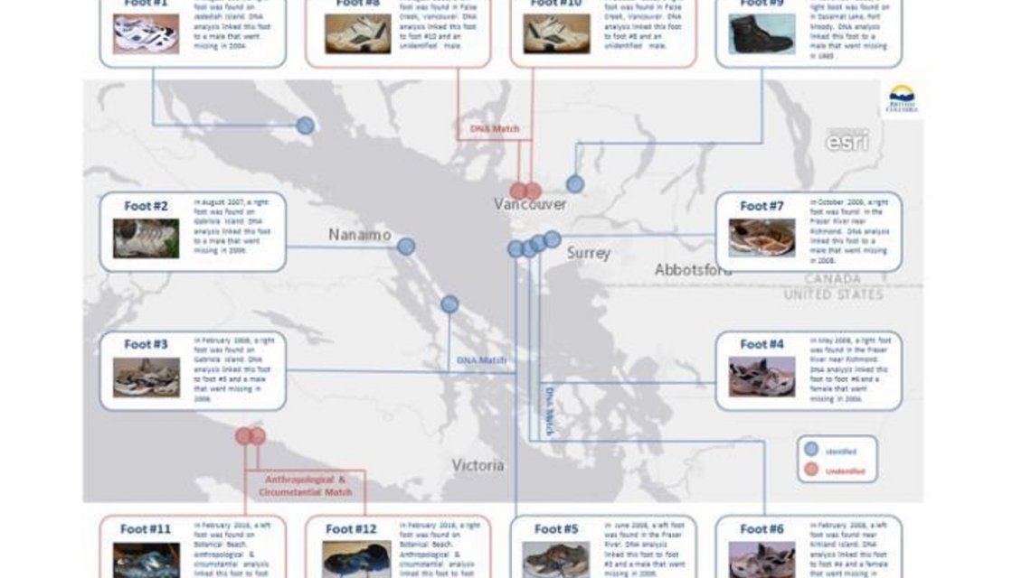 Los estudios de ADN dieron lugar a hipótesis más comunes, como el hallazgo de un hombre de Vancouver que estaba desaparecido y sufría una depresión profunda. "En unas pocas ocasiones, el pie izquierdo que se correspondía con el derecho apareció con pocos meses de diferencia", y permitieron identificar a un joven de 21 años en 2004, cuando fue denunciado como desaparecido.