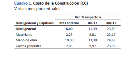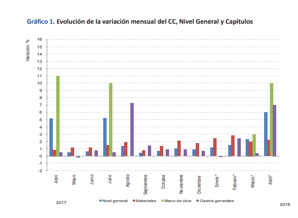 El Nivel general del Costo de la Construcción en Santa Fe registró en abril de 2018 un aumento del 6% con relación al mes anterior, el más alto en lo que va del año, según datos suministrados por el Instituto Provincial de Estadística y Censos (IPEC). Este resultado surge como consecuencia del alza del 2,23% en el capítulo Materiales, 10,00% en Mano de obra y 7,05% en el capítulo Gastos generales.