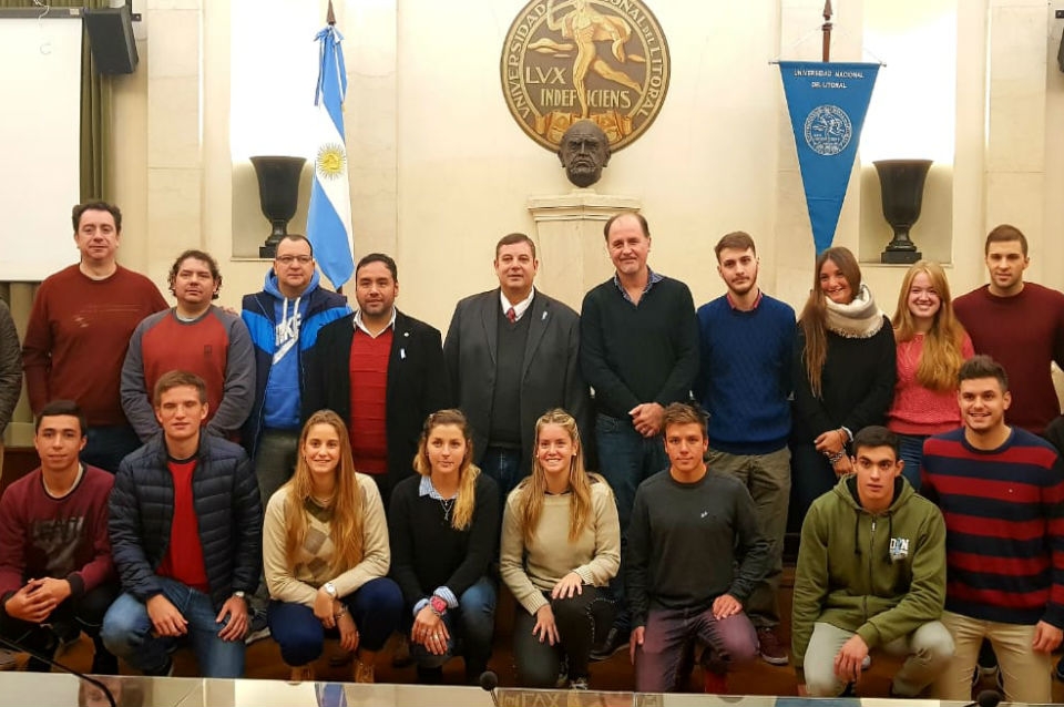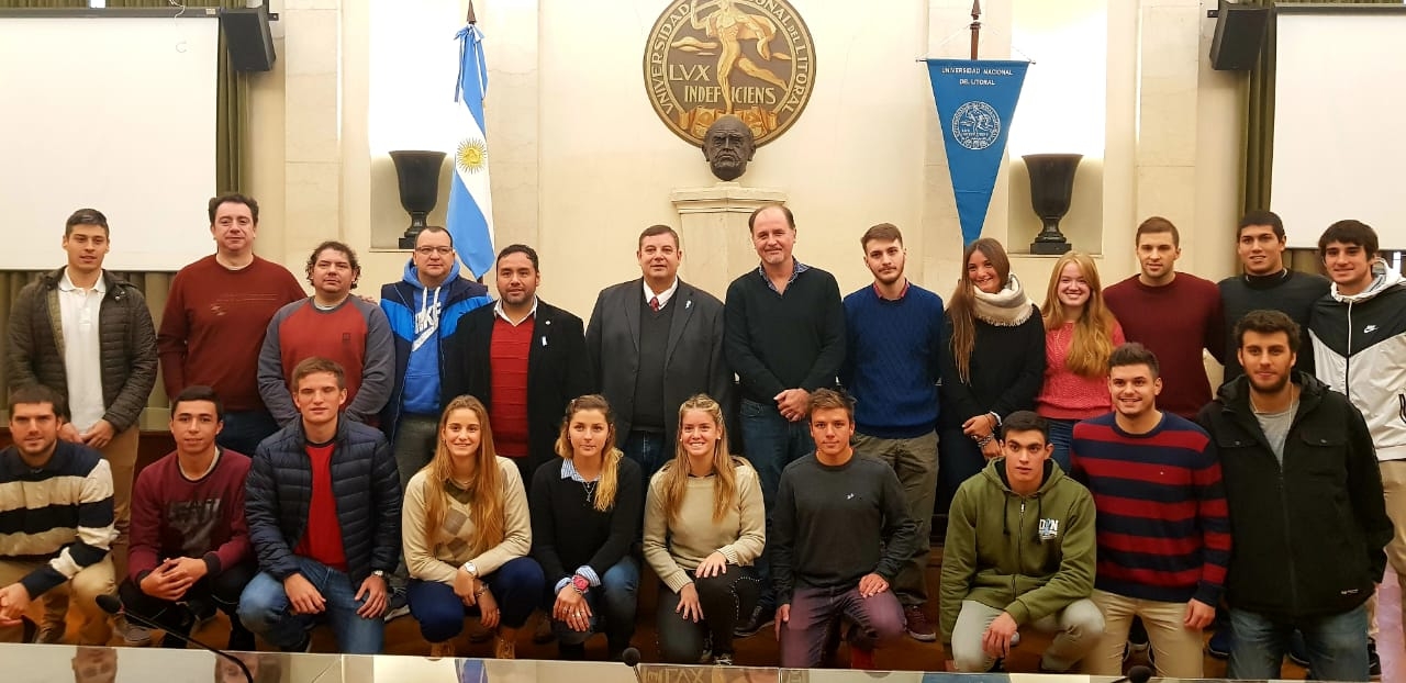 Parte de la delegación que participó de la final nacional de los Juegos Universitarios 2018, realizados hace unos días atrás en Buenos Aires, fueron recibidos por el rector de la Universidad Nacional del Litoral (UNL), Enrique Mammarella, esta mañana en el Consejo Superior.