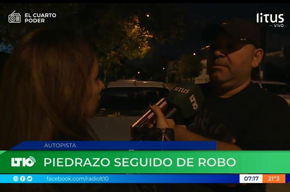 Bress detuvo la marcha a la altura del barrio Las Vegas (jurisdicción de Santo Tomé) y contó por LT10 que el objeto arrojado era “una piedra de grandes dimensiones”. “No pude volantear, me rompió la parte de abajo del auto y me detuve en el cruce con la ruta nacional 19. Cuando estaba mirando los daños, veo que se detiene otro vehículo, un (Chevrolet) Corsa blanco con una familia completa”, relató al móvil de la emisora.