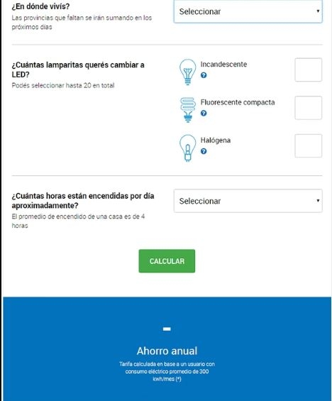 Al ingresar a la plataforma, se puede estimar cuánto se reduce el gasto anual o mensual en el costo de la electricidad con el cambio, ingresando previamente el tipo de lámpara que se usa y la cantidad de horas que está encendida por día.