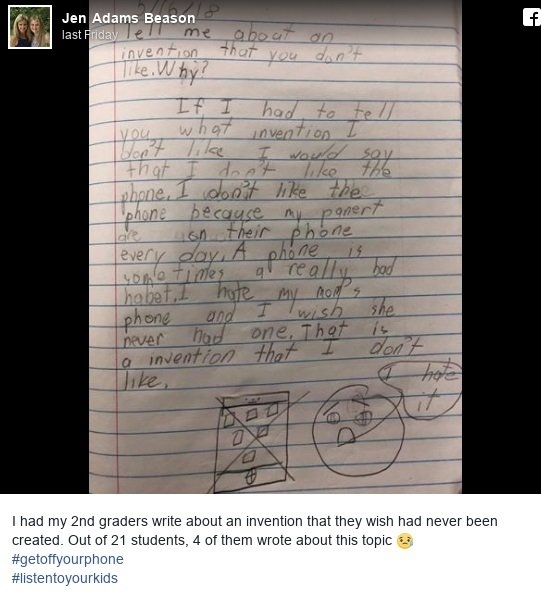 Jen Adams Beason vive en Luisiana, Estados Unidos, y es docente de alumnos de segundo grado, chicos de siete y ocho años. La semana pasada les dio a sus alumnos una tarea para el hogar: les pidió que describieran algo que desearan que nunca hubiera sido inventado. Y las respuestas llamaron la atención de muchos padres.