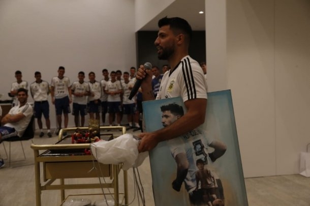 En tanto, sus compañeros lo sorprendieron con una enorme torta de chocolate y le regalaron un emotivo cuadro al óleo donde se ve la imagen del Kun con la camiseta de Argentina y su número 9 en la espalda, y un “mini Kun” con una foto corriendo a la pelota en su niñez.