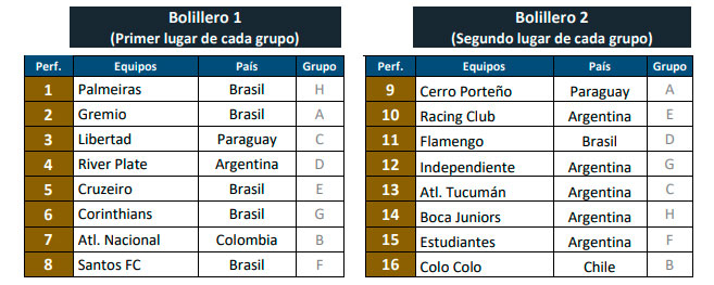 Lo primero que se debe tener en cuenta, es que los 16 clasificados se dividieron en dos grupos de ocho, y que dentro de cada grupo, se estableció un orden para cada equipo. Así las cosas, el sorteo comenzará con este esquema.