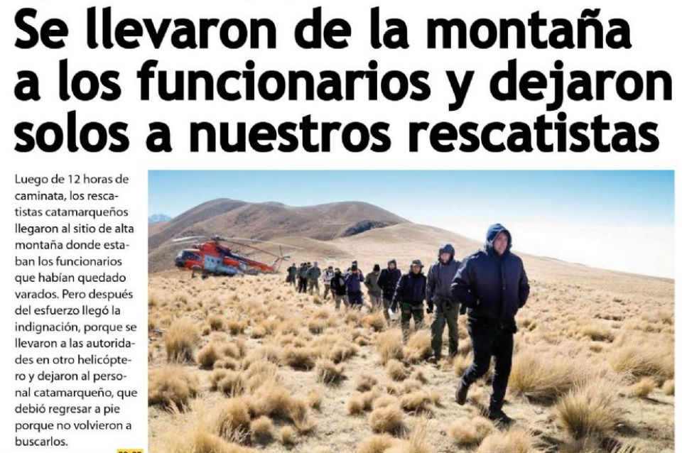 En tanto que el segundo, dice: "Luego de 12 horas de caminata, los rescatistas catamarqueños llegaron al sitio de alta montaña donde estaban los funcionarios que habían quedado varados. Pero después del esfuerzo, llegó la indignación, porque se llevaron a las autoridades en otro helicóptero y dejaron al personal catamarqueño, que debió regresar a pie porque no volvieron a buscarlos".