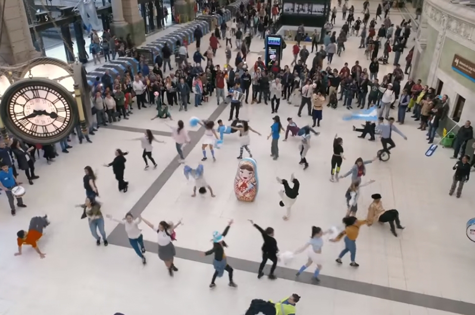 La acción comenzó con un músico entonando una versión en acordeón del famoso tema Estás para ganar de Johny Tolengo. A partir de ahí se empezaron a sumar bailarines, acróbatas, freestylers y hasta un biker para transformarlo en un flashmob lleno de “alegroshky”.