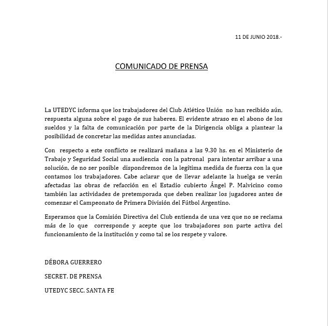 El viernes pasado, Diez en Deportes contó que los que los empleados de Unión nucleados en el gremio de Utedyc confirmaron una nueva medida de fuerza a raíz del atraso en el pago de salarios. Lo hicieron visible mediante un comunicado oficial y, después de un fin de semana a la espera de una solución, este lunes se reiteró la medida de mantener la retención de actividades ante la "falta de respuestas".