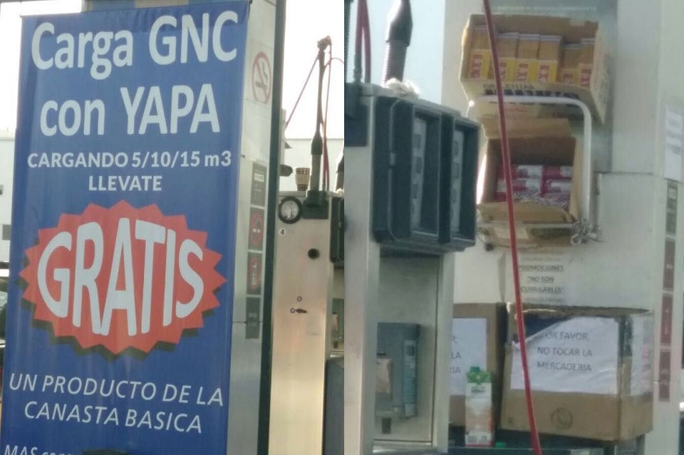 La primera es una una estación de servicio YPF ubicada de la ciudad mendocina de San José, que comenzó a obsequiar productos de la canasta básica a los clientes que carguen GNC en sus surtidores.