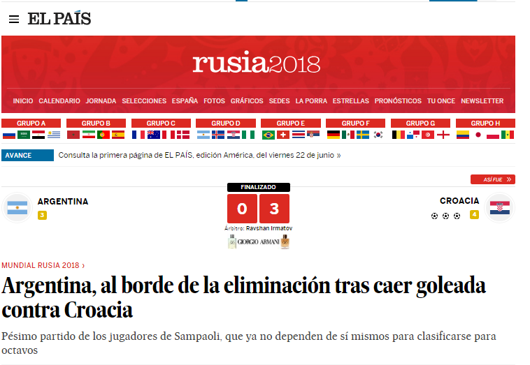 El diario español Marca advirtió que el combinado albiceleste "quedó al borde de la eliminación" por el duro resultado de esta tarde en Nizhny Novgorod y tituló: "Vergüenza Argentina".