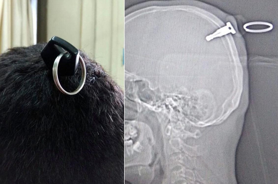 En las fotografías emitidas por la televisión norteamericana se observa el intento de los médicos indios por tratar a un hombre que tenía una llave de motocicleta clavada en su cráneo tras una pelea. El joven de 19 años fue llevado al hospital con la llave incrustada casi cinco centímetros en su cabeza.