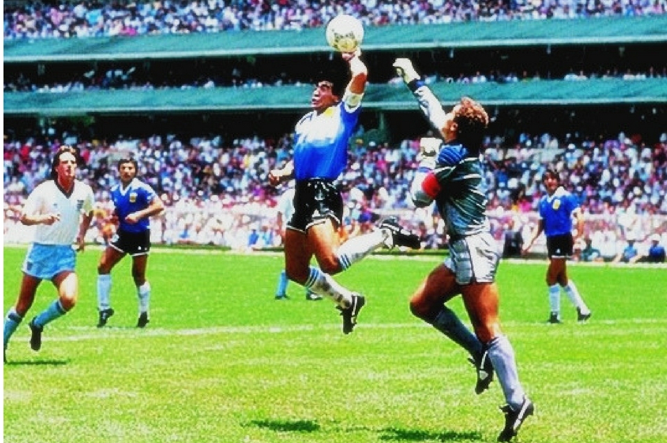 Fue la tarde en la que MARADONA estampó un sello eterno en la historia de la Copa del Mundo. Primero, con la "Mano de Dios" -foto de arriba-, a los 6 minutos del segundo tiempo. Le robó a Inglaterra y después le demostró su inmensidad futbolística, apilando a cuanto rival se cruzó en el camino, para marcar el segundo tanto, a los 10 (sí, justo al minuto "10"). El mejor gol de todos los tiempos. Luego, cerca del final, descontó Gary Lineker (sería el goleador del torneo con 6 tantos).