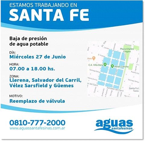 Por otra parte, se anticipó a los usuarios de un sector del barrio Sargento Cabral que el miércoles 27 entre las 07:00 y las 18:00 disminuirá la presión del agua potable.En este caso se debe a los empalmes correspondientes a la renovación de 480 metros de cañería distribuidora y más de 40 conexiones domiciliarias de agua potable existentes sobre calle Velez Sarsfield –mano Oeste- entre Salvador del Carril y Llerena para mejorar la prestación del servicio.