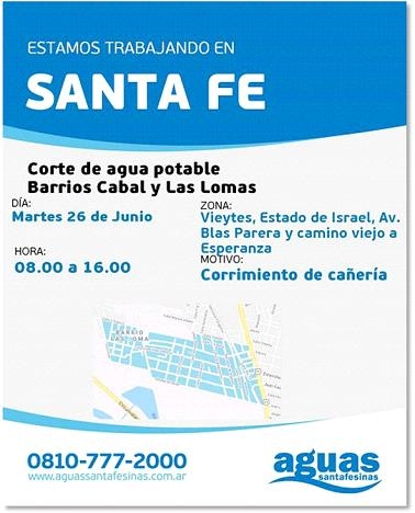 Aguas Santafesinas informa a los usuarios de barrio Cabal y Las Lomas que este martes 26 entre las 08:00 y las 16:00 se interrumpirá el suministro de agua potable. Es para poder hacer el corrimiento de la cañería existente en Espora entre Pje. Santa Fe y Av. Blas Parera por la obra de desagües que se desarrolla en el sector.