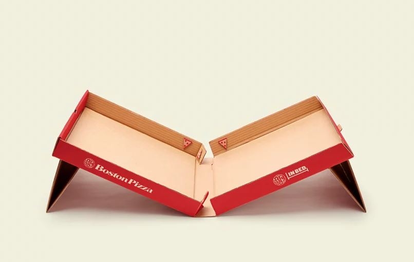 La cadena canadiense Boston Pizza, y en el marco del Día del Padre, creó una caja de pizza que se despliega y se convierte en mesa, ideal para comer en la cama. Al principio, la caja de cartón parece una caja de pizza común y corriente, pero al abrirla se descubren las patas incorporadas que se pliegan y se enganchan en una mesa.