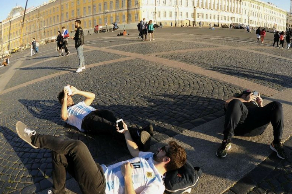 Los hinchas que llegaron en masa este lunes para alentar al seleccionado argentino en su crucial encuentro ante Nigeria "coparon" literalmente la bella San Petersburgo, empezando por la plaza principal y continuando luego por las calles que serpentean entre los numerosos canales que le dan a esta ciudad el mote de "Venecia rusa", hasta amanecer -a las 2.30 local-, reconociéndose a cada paso por la inundación de banderas y camisetas celestes y blancas.