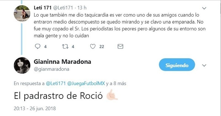 Hasta que Gianinna Maradona, quien estaba enganchada en Twitter por todas las noticias que llegaban de su padre, desenmascaró al hombre: "el padrastro de Rocío", respondió junto con un pulgar para arriba, ante el comentario de una seguidora que decía lo siguiente: "Lo que también me dio taquicardia es ver como uno de sus amigos cuando lo entraron medio descompuesto se quedo mirando y se clavo una empanada. No fue muy copado el Sr. Los periodistas los peores pero algunos de su entorno son mala gente y no lo cuidan".