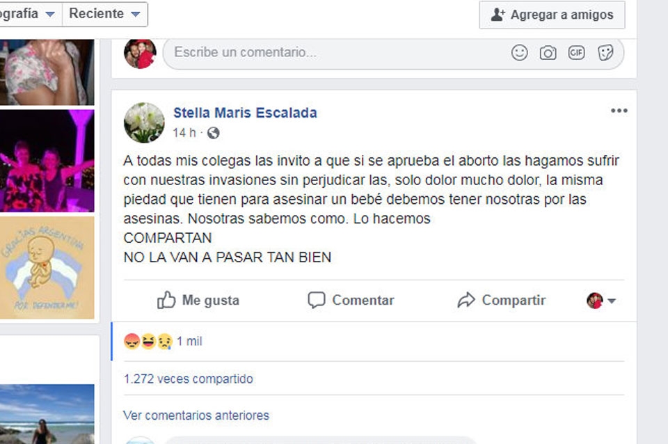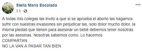 En facebook, la mujer hizo varias publicaciones y comentarios del tenor de que "si se aprueba el aborto las hagamos sufrir con nuestras invasiones sin perjudicarlas, solo dolor mucho dolor, la misma piedad que tienen para asesinar un bebé debemos tener nosotras por las asesinas. Nosotras sabemos como. Lo hacemos”.