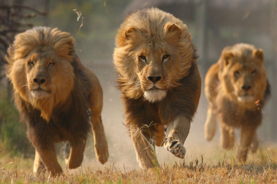 Estaban persiguiendo rinocerontes en una reserva privada cuando fueron hallados por la manada de felinos.