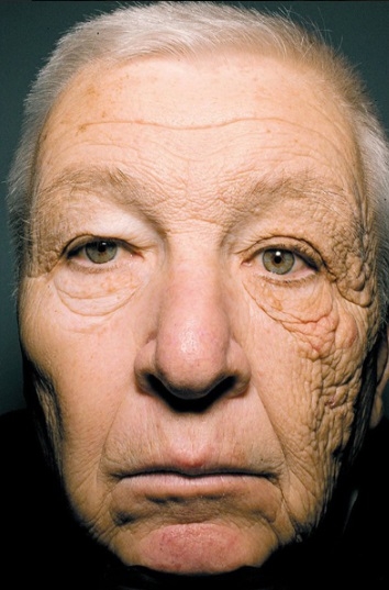 McElligott tenía 69 años cuando se tomó la foto, pero su lado izquierdo (el derecho según lo miras) parece 20 años más viejo, con muchas más arrugas, manchas y perdida de elasticidad de los tejidos.