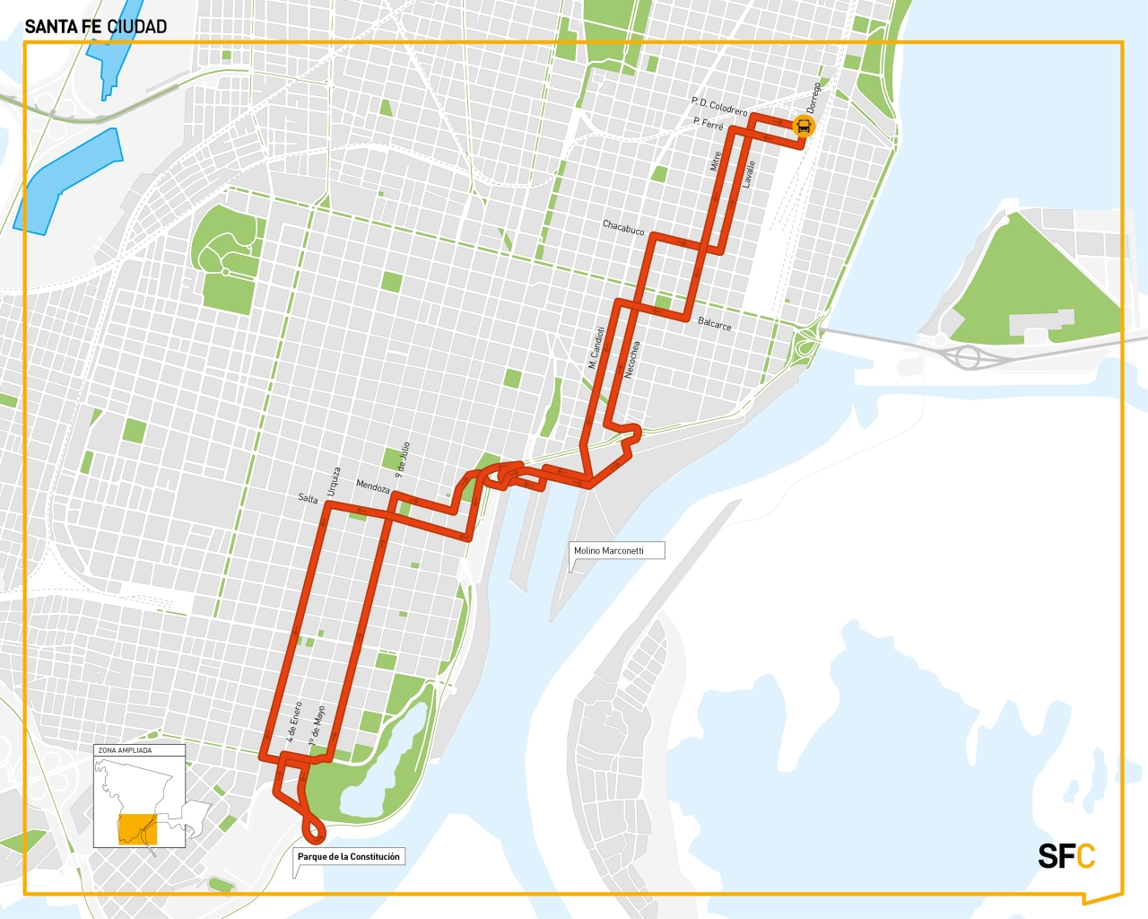 El nuevo recorrido inicia en Dorrego y Pedro Ferré, y luego continúa por Mitre, Balcarce, Marcial Candioti y avenida Alem. Luego ingresa al puerto local circulando por las calles Dr. N. Farías, Lavanderas del Puerto y avenida Leandro N. Alem. Posteriormente sigue por Belgrano, avenida Leandro N. Alem, avenida 27 de Febrero, Salta, Urquiza, avenida J. J. Paso, 1º de Mayo y Rotonda Club Náutico Sur. Ya de regreso a la parada recorre calle 4 de Enero, avenida J.J Paso, 9 de Julio, Mendoza, Rivadavia, avenida Leandro N. Alem, Dr. N. Farías, Sarmiento, avenida Leandro N. Alem, Alberdi, avenida Leandro N. Alem, Santa María de Oro, General Necochea, Castellanos, Lavalle, Pedro Díaz Colodrero y Dorrego a parada.