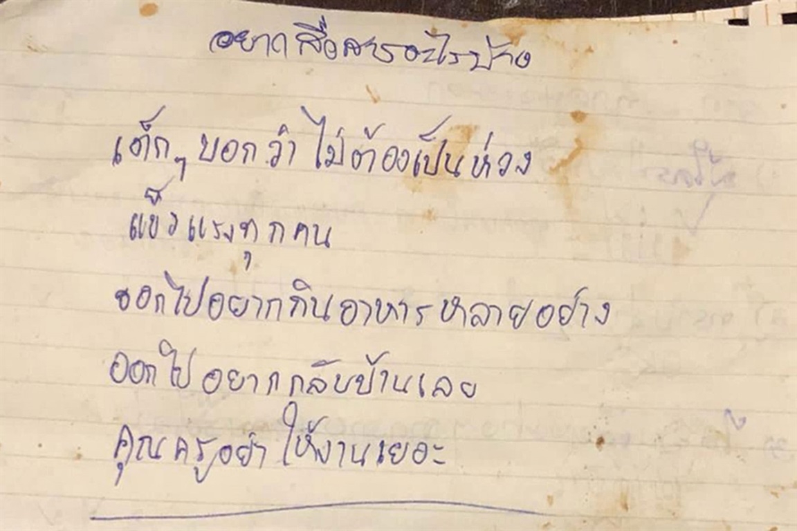 En las cartas, los chicos pidieron a sus familias que no se inquietaran por ellos y también expresaron algunos deseos para cuando salgan de la cueva. "No se preocupen, papá y mamá. Hace dos semanas que me fui pero volveré para ayudarlos en el local", escribió Bew, cuyos padres atienden un almacen. Piphat, conocido como Nick, pidió: "Si salgo, por favor, llévenme a comer moo krata", un plato tailandés a base de cerdo y verduras.