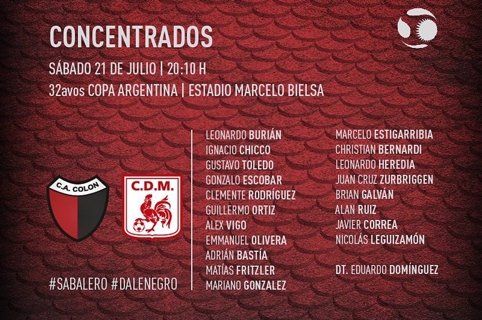 Los 17 jugadores que convocó Eduardo Domínguez para el encuentro en Rosario: Los arqueros son: Burian y Chicco. Los defensores: Toledo, Olivera, Ortiz, Escobar, Clemente, Alex Vigo. Los mediocampistas: Bernardi, Bastia, Fritzler, M. Gonzalez, Estigarribia, Heredia, Zurbriggen, B. Galvan. DEL: Leguizamon, A. Ruiz, Correa.