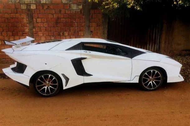 Tras definir el boceto y el plan de transformación, lo primero que hizo fue cortar el pilar A (el parante delantero) y bajar el techo. Asegura que en el proceso utilizó materiales baratos, livianos y maleables. Pasó noches enteras entre chapas de aluminio, espuma de poliestireno, casi 500 kilos de masa acrílica y amigos que se dispusieron a ayudarlo. Uno de ellos compró una miniatura del Aventador para guiarse mejor y otros donaron parte del material.
