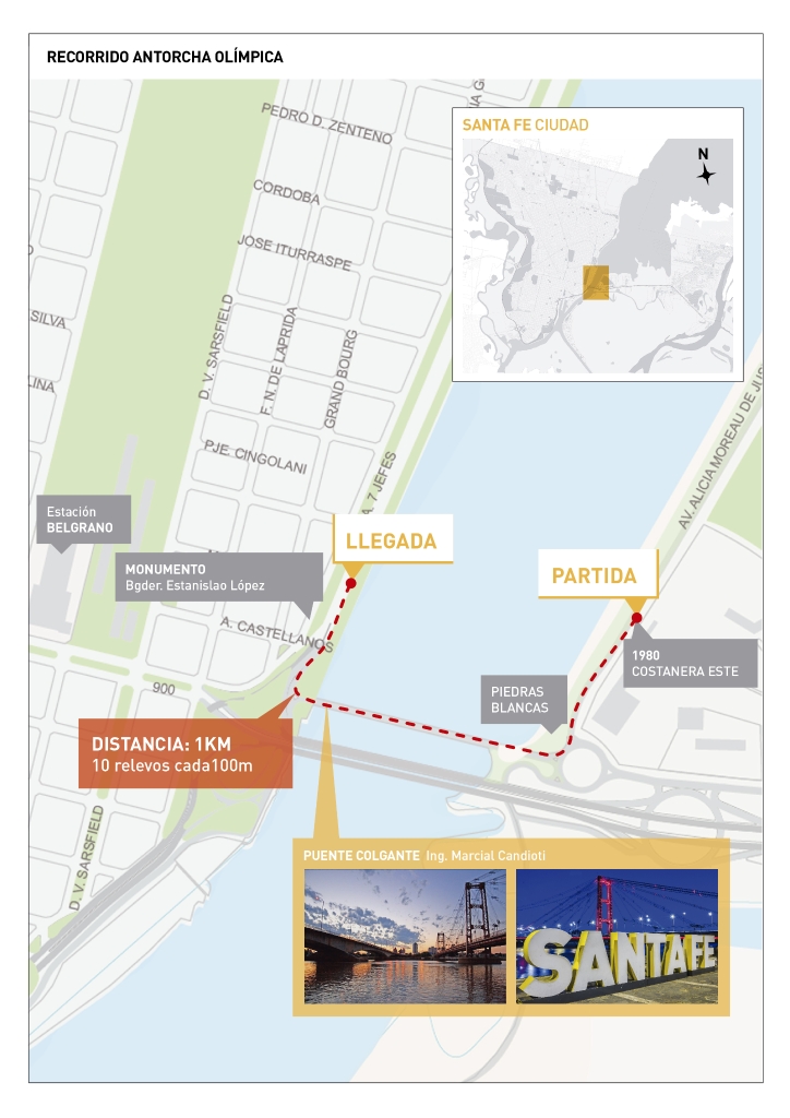 Deportistas, personalidades de la cultura y de la comunidad de la Ciudad serán los encargados de portar la llama olímpica desde la Costanera Este, cruzarán el Puente Colgante -uno de los máximos íconos de la capital provincial- y llegarán al Monumento del Brigadier Estanislao López, emplazado en la Costanera Oeste. El evento será el 11 de agosto a las 17 y culminará con un espectáculo musical para disfrutar en familia.
