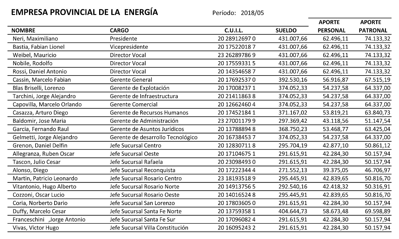 En tanto, se conocieron no sólo los salarios de los directores y gerentes sino también de los jefes de las once sucursales que tiene la EPE, quienes también registran ingresos mensuales que se acercan a los 300 mil pesos. De todos, el jefe de la sucursal Santa Fe Norte (hay también un jefe de Santa Fe sur) supera a sus pares y se alza con $404 mil. Las otras sucursales son: Centro, Oeste, Rafaela, Reconquista, Rosario Centro, Rosario Norte, Rosario Oeste, San Lorenzo y Villa Constitución.