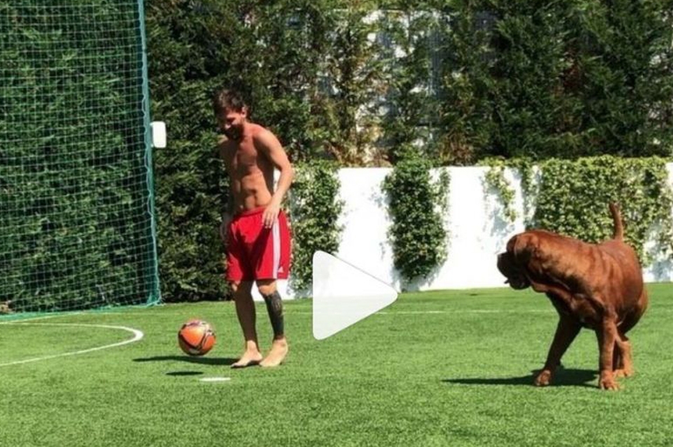 Allí se ve a Leo volviendo loco su perrito Hulk y tirándole sombreritos en la cancha que tiene en su casa.