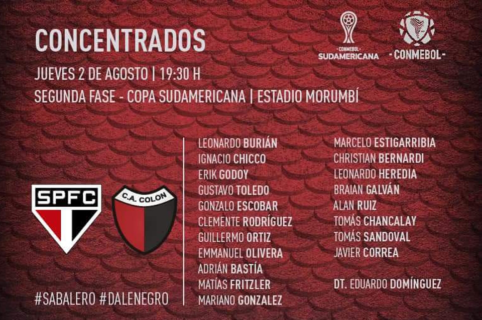 Colón jugará ante el San Pablo el jueves 2 desde las 19:30 en el Morumbí por la segunda fase de la Copa Sudamericana. El equipo de Domínguez llega prácticamente sin competencia oficial, jugó un solo partido por Copa Argentina ante Deportivo Morón mientras que el San Pablo está en la mitad de la temporada.