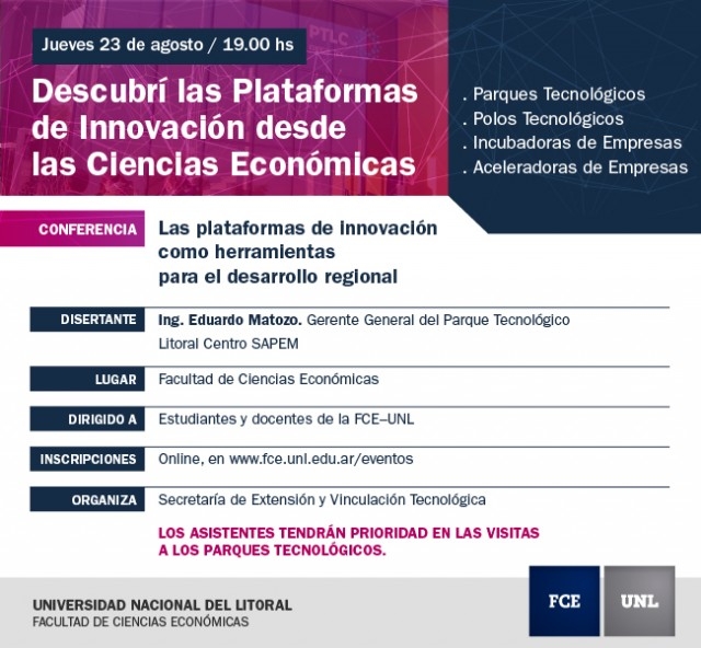 La Facultad de Ciencias Económicas invita a docentes y estudiantes a la conferencia “Las Plataformas de Innovación como herramientas para el desarrollo regional”, a cargo del Ing. Eduardo Matozo, gerente General del Parque Tecnológico Litoral Centro SAPEM.