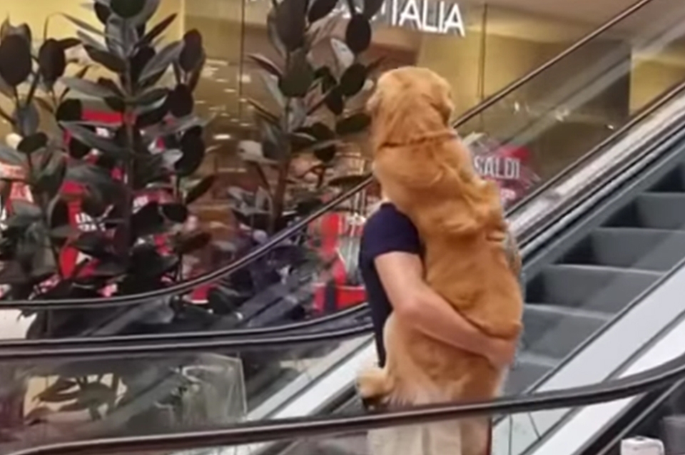 Un video súper tierno enamora a todos en las redes sociales. En las imágenes se ve a un hombre alanzando a upa a su gran perro porque le da miedo subir por la escalera mecánica de un shopping.
