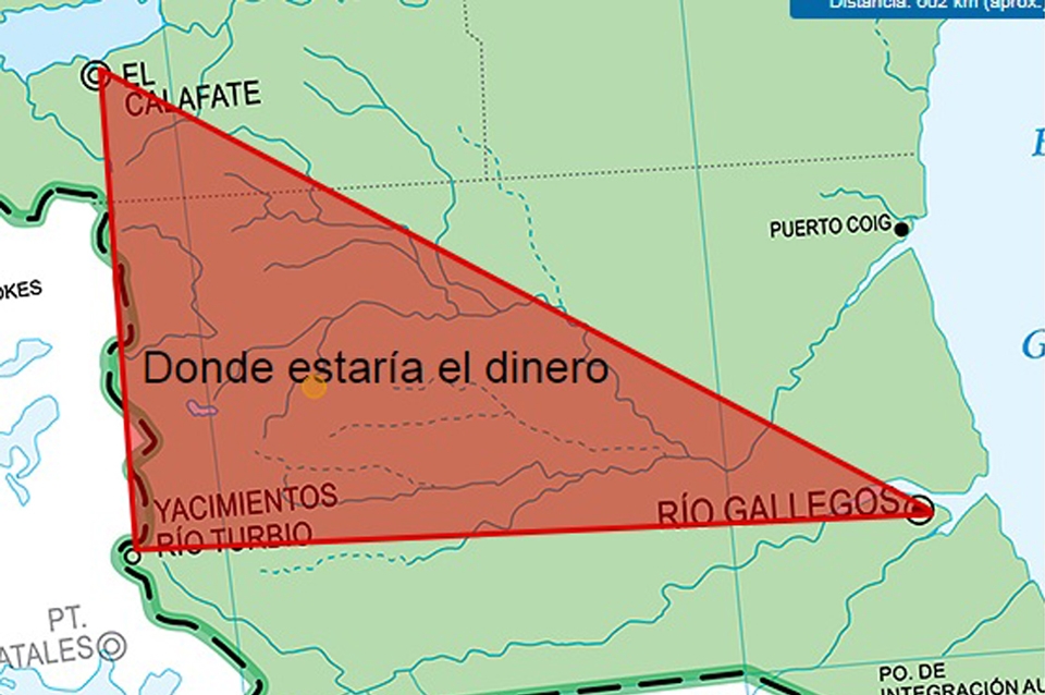 Lamadrid afirma que "este dinero está enterrado tal como lo hizo alguna vez Pablo Escobar o las Farc. Este dinero según las investigaciones que denuncié en la justicia y lo escribí en el libro está enterrado. Recordemos las bóvedas y los fajos termosellados, se ideó todo un mecanismo para que esta plata en efectivo no sufgra deterioro. Y siguió: "según pude investigar este montón de plata está en un área que está delimitada en un triángulo que está formado por Rio Gallegos a Río Turbio y el Calafate. Se trata de cinco estancias que denuncié en la Justicia hace años. Ahora sale lo de los cuadernos pero no se vincula con mi invenstigación. Esto no es casual. Si vemos las personas que deberán presentar declaración entre ellas está el juez Oyarbide. Esto quiere decir que el mecanismo es tan grande y perverso que si el juez no puede aplicar castigo termina uniéndose al culpable".