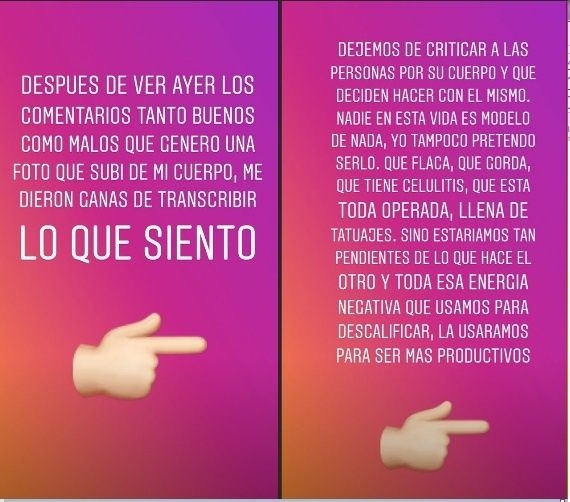 Al ver todos los mensajes, Luli decidió realizar un fuerte descargo en sus historias de Instagram e invitó a la reflexión: "Después de ver ayer los comentarios, tanto buenos como malos, que generó una foto que subí de mi cuerpo, me dieron ganas de transcribir lo que siento. Dejemos de criticar a las personas por su cuerpo y que deciden hacer lo mismo. Nadie en esta vida es modelo de nada, yo tampoco pretendo serlo".