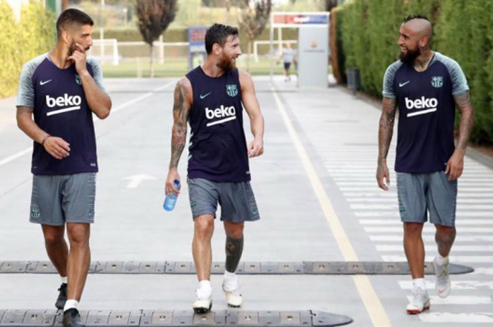 El chileno tuvo su primera práctica con los culés y sus compañeros lo recibieron de gran manera. Foto con Messi y charla con el DT.