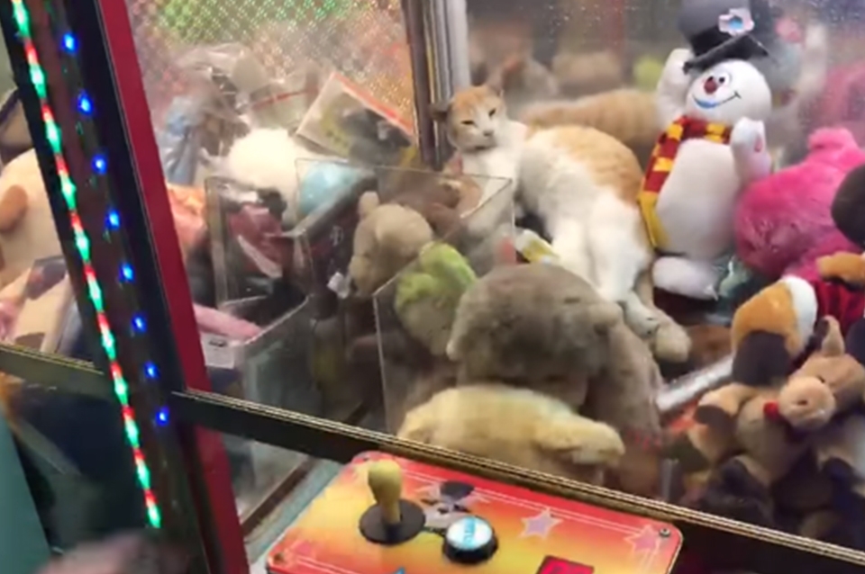 El gatito estaba durmiendo profundamente al lado de los peluches, como si fuera uno más. En el video se puede ver cómo uno de los hombres trata de sacar al animal con ayuda del gancho, sin embargo, el animal ni se percata del hecho. El video es de comienzos de este año, pero explotó en las redes hace algunos días.