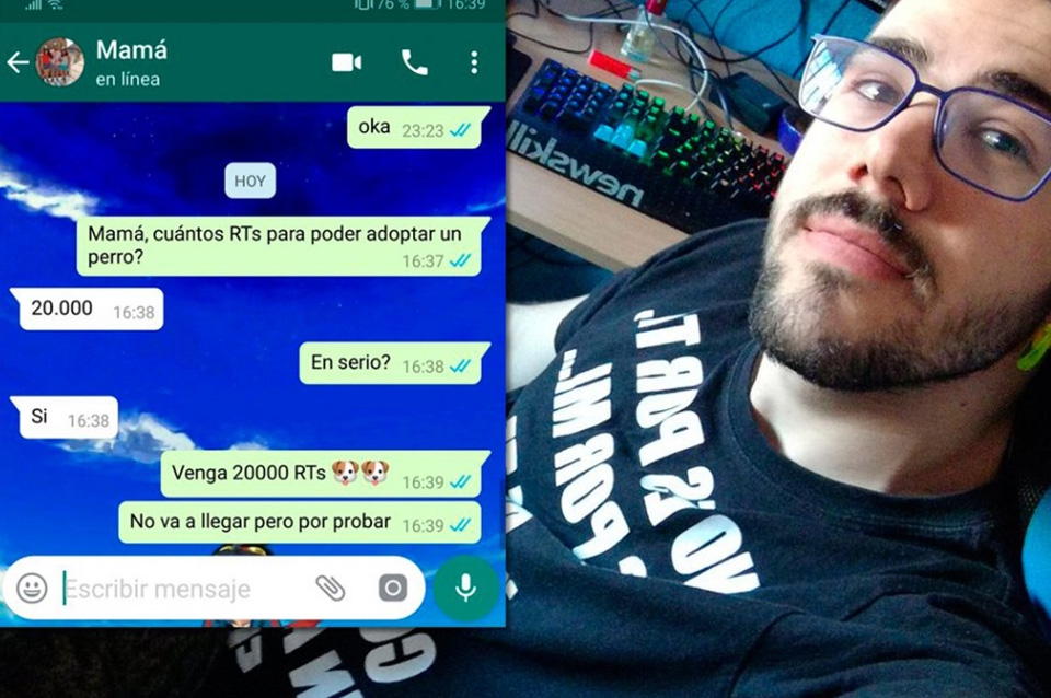 Un adolescente de 18 años de España inició el martes pasada una campaña en la red social para adoptar a un perro. El joven compartió una captura de la conversación de WhatsApp con su mamá en la que le exige que llegue a 20 mil retweets como si fuese una misión casi imposible.