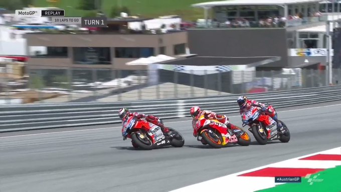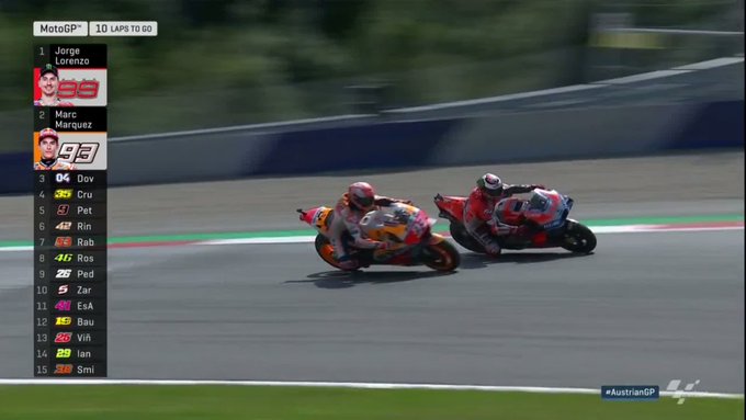 Se preveía una batalla a tres bandas, pero Dovizioso no pudo aguantar el paso por vuelta de los españoles y dejó en bandeja la batalla entre futuros compañeros. Varios adelantamientos acabaron un último intento en la tercera curva por parte del ilerdense. Intentó hacer un clásico ‘block pass’ bloqueando la salida de curva de su compatriota, pero Lorenzo aceleró mejor y se acabó llevando el triunfo. El primero de muchos duelos que se vienen.
