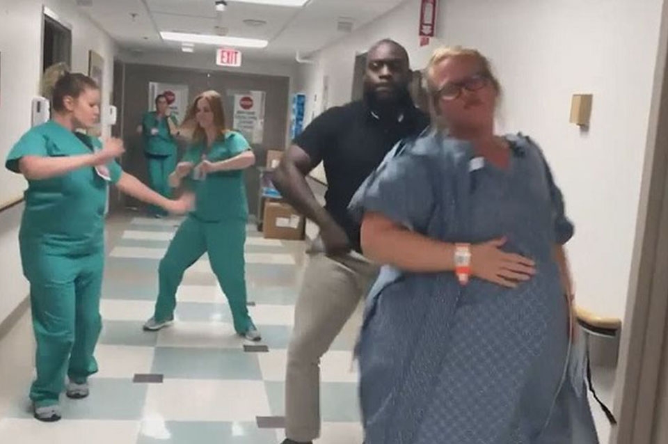 Embarazada de 40 semanas, prefirió no permanecer inmóvil durante la espera y, al contrario de lo que podría apetecerle a cualquier mujer en su situación, se puso a bailar por los pasillos junto a su marido Miller y parte del personal del hospital Manatee Memoria de Florida.
