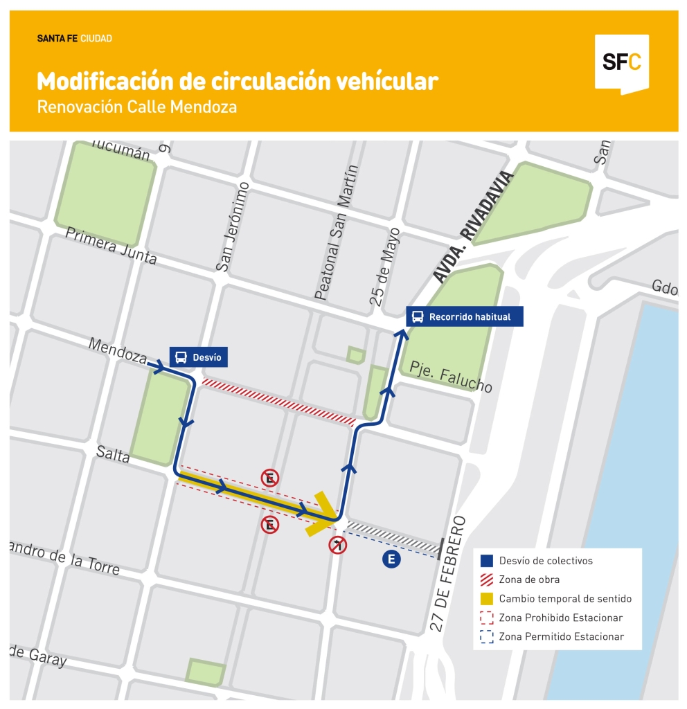 Los trabajos implicarán un corte total en calle Mendoza entre 25 de Mayo y San Jerónimo. Por este motivo, mientras duren las tareas, se reordenará el sentido vehicular en la zona y se modificará la mano de calle Salta que irá de Oeste a Este, entre San Jerónimo y 25 de Mayo. Esto le sacará presión al tránsito en calles Juan de Garay y Tucumán, ya que los colectivos que transitaban por Mendoza, irán por Salta.