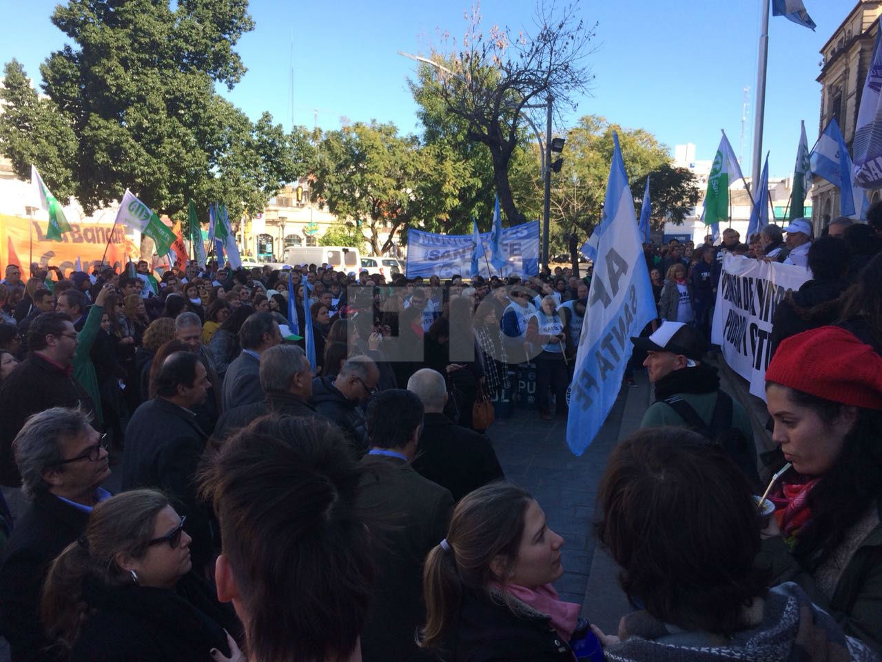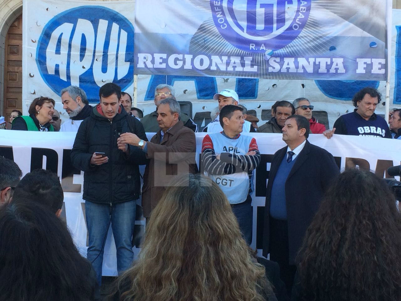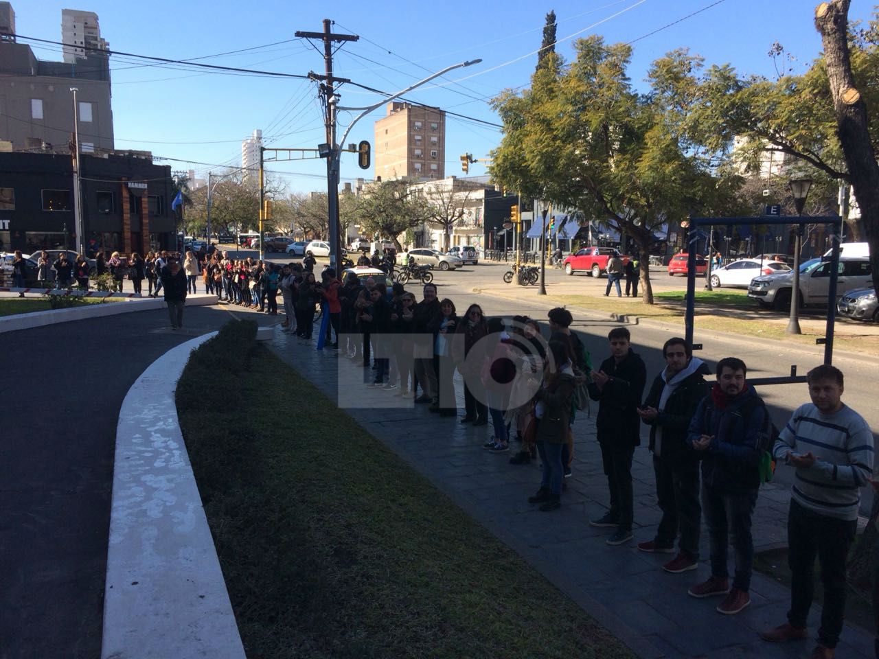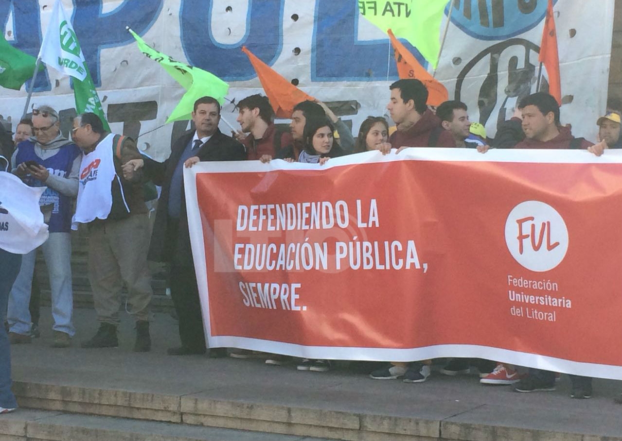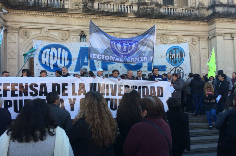 En el caso de la UNL, se realizó un abrazo simbólico al edificio de Rectorado, en Boulevard Pellegrini al 2700. La iniciativa contó con la presencia de representantes de distintos gremios (vinculados o no a la Academia), como también de alumnos, docentes, no docentes y del propio rector Enrique Mammarella, junto a otras autoridades.
