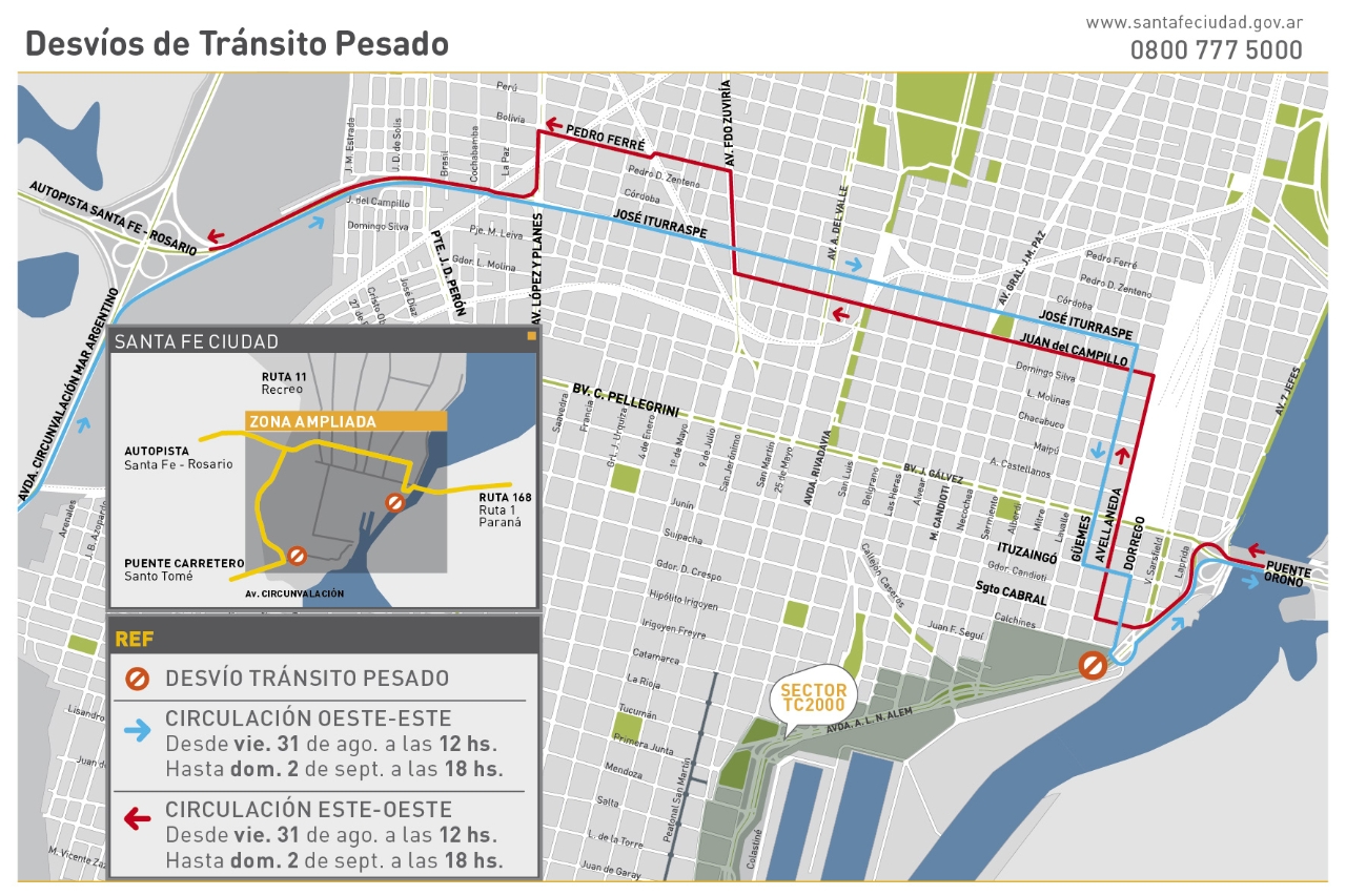 Por su parte, el tránsito pesado que ingresa por el acceso Este de la Ciudad, deberá circular por avenida Alem, tomar calle Sargento Cabral, luego Lavalle a Juan del Campillo, continuando por Facundo Zuviría hasta Pedro Ferré, luego volviendo por López y Planes para finalmente circular por Iturraspe a recorrido habitual a Autopista Santa Fe-Rosario.