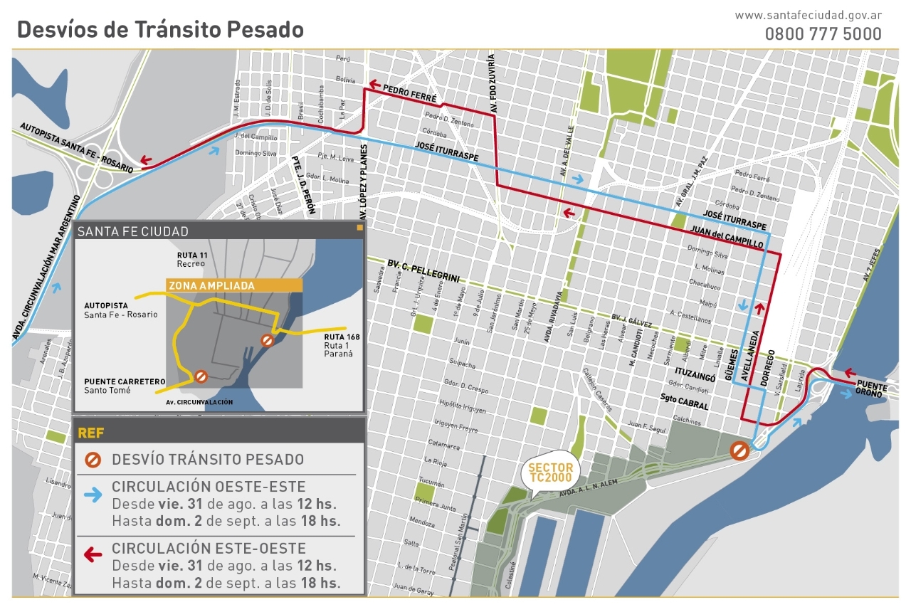Luego, los vehículos de gran porte que entran por el acceso Este de la Ciudad, deberán circular por avenida Alem, tomar calle Sargento Cabral, luego Lavalle a Juan del Campillo, continuando por Facundo Zuviría hasta Pedro Ferré, volver por López y Planes y finalmente circular por Iturraspe a recorrido habitual a Autopista Santa Fe-Rosario.Ingreso al Casino y Shopping.