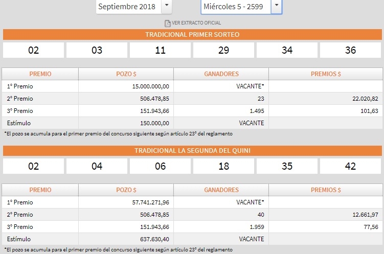Ayer por la noche, se concretó el Sorteo del Concurso N° 2599de Quini 6 quedando vacantes los premios más importantes ofreciendo un pozo estimado de $130 millones para el próximo sorteo.