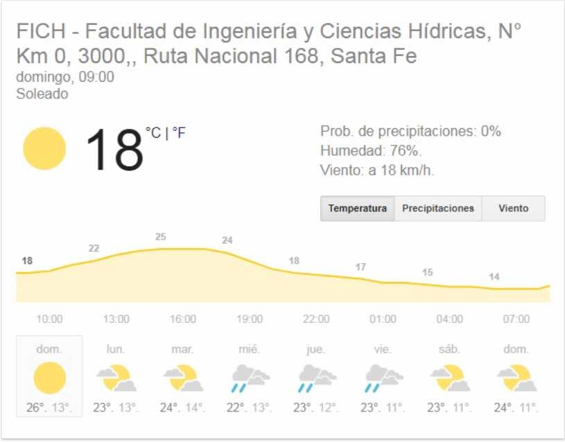 Según el Centro de Informaciones Meteorológicas de la Facultad de Ingeniería y Ciencias Hídricas de la UNL, las buenas condiciones del clima llegarían hasta el martes con cielo despejado, con alguna nubosidad variable, sobre todo hacia las últimas horas del día. Condiciones estables pero desmejorando algo hacia la tarde/noche. Temperaturas con poco cambio. Vientos leves a moderados predominando del sector este, oscilando entre el noreste y el sureste.