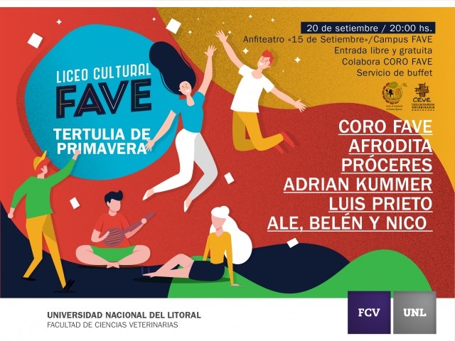 Las Direcciones de Cultura de las Facultades de Ciencias Veterinarias y de Ciencias Agrarias invitan a compartir, disfrutar y acompañar esta Tertulia de Primavera, el próximo jueves 20 de setiembre, a partir de la hora 20, con entrada libre y gratuita, en el Anfiteatro “15 de Febrero”, FCV.
