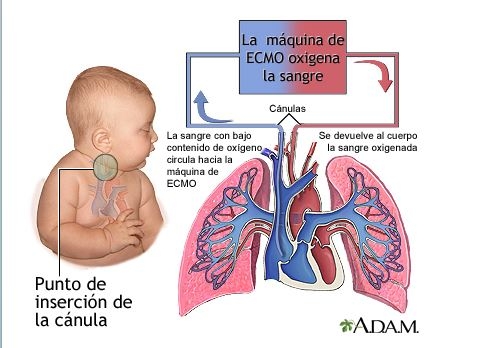 "La sangre del paciente es drenada del organismo desde una cánula colocada en una vena central (habitualmente vena femoral o vena yugular interna derecha en el caso de las cánulas doble lumen), pasada a través de un oxigenador de membrana (comúnmente llamado pulmón artificial) y reinfundida a través de una cánula colocada en una vena (ECMO veno-venosa o VV-ECMO) o una arteria (ECMO veno-arterial o VA-ECMO)", explica una página especializada en Medicina.